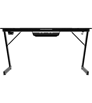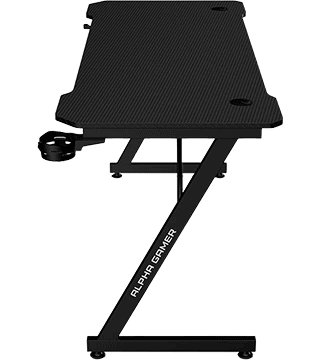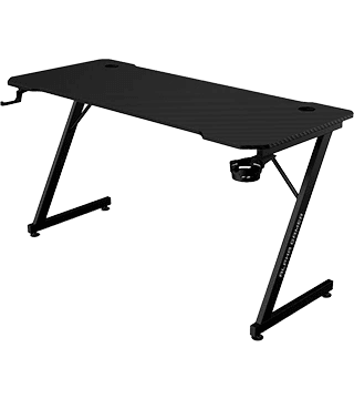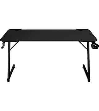 Mesa de gaming com tampo em carbono, suporte para headset e pés ajustáveis. Espaço perfeito para setups até 140 cm.