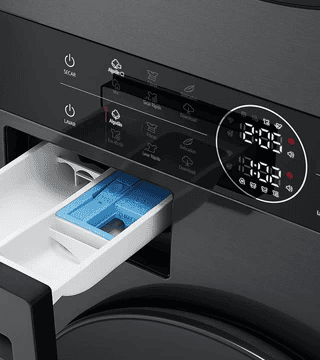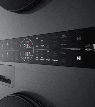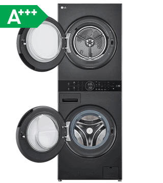 A LG WashTower WT1210BBF combina lavar 12 kg e secar 10 kg com eficiência A-10% e A+++. Oferece AI DD™, Steam™, TurboWash™360, Dual Inverter e controlo Wi-Fi.