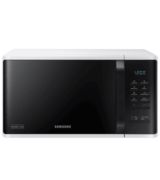 Micro-ondas Samsung branco com 23L, display digital e função de descongelação rápida para maior comodidade.